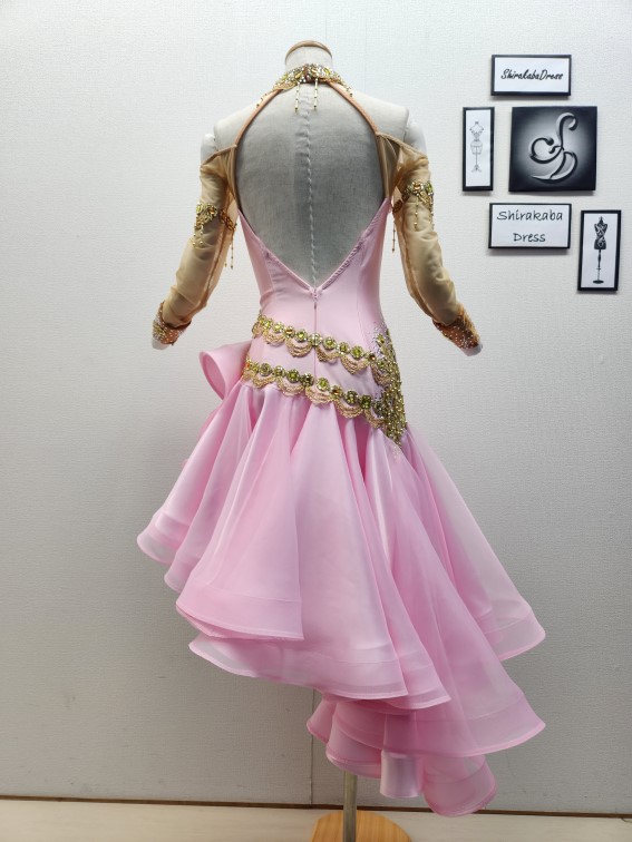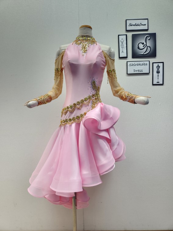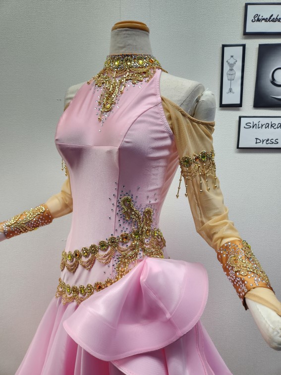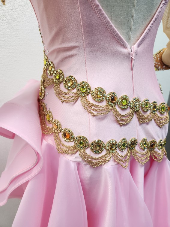 スタイル:キュートなピンクにゴールドの飾りが映える、大人可愛い社交ダンスドレスです。