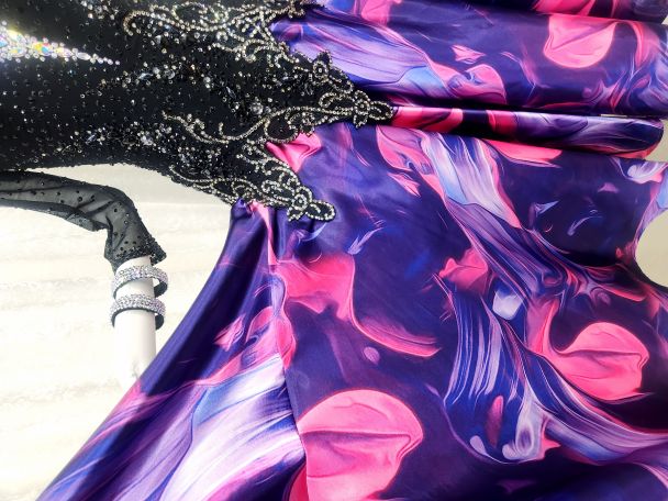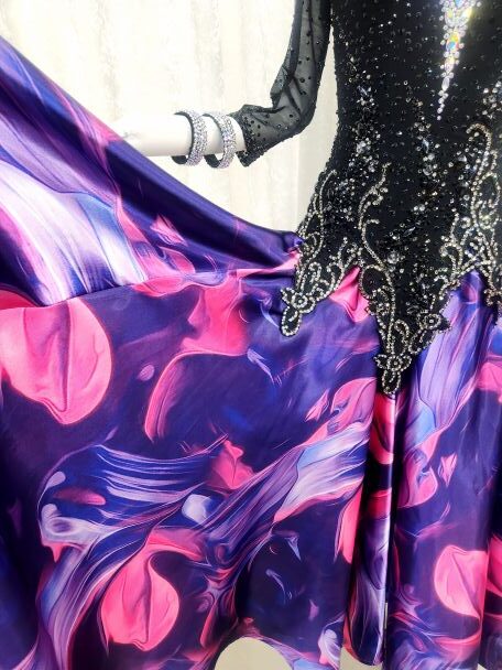 スタイル:レオタードトップにスカートを装着するタイプとなりますので小柄な方でも対応可能。個性的なサテンプリントが目を惹きます。