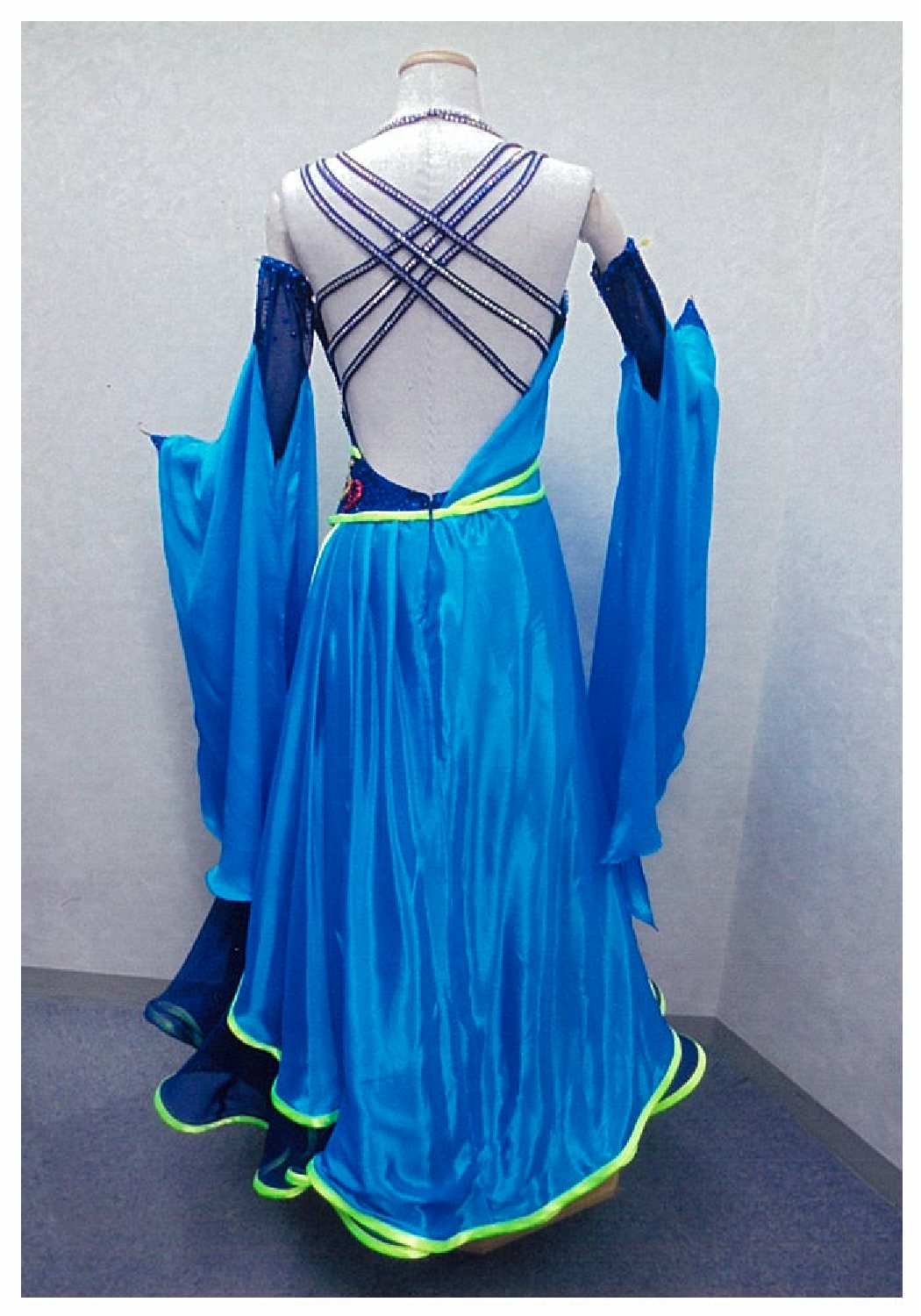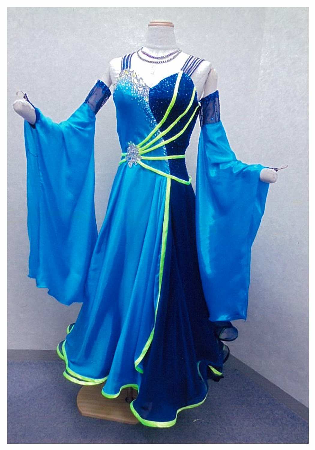 スタイル:競技向きの2色使い。ターコイズブルーの光沢あるスタンダードドレス。とても軽くて動きやすい。